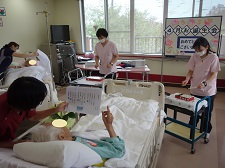 『メイクボランティア M.B.L』の皆様には、コロナ禍前には当院で年間6 回”お洒落クラブ”という患者様方向けのメイクやエステのボランティア活動をしていただいておりました。今年は代表の宮崎優子先生よるレクチャーDVD映像を用いて、レクワーカーによるお洒落クラブ(セルフハンドマッサージ)を内科病棟にて定期開催いたします。お部屋のベッドにて実施しました女性患者様は、ご自身で指先へ保湿クリームをゆっくり塗り伸ばし「気持ち良いわねぇ。」とニコリ。気持ち良さからかお話も弾み、街のサロンのような雰囲気でお過ごしいただきました。デイルームにて実施した際は男性患者様もご参加くださり、「指先が冷えててね。少しあったかくなると良いんだけど。」と、動画の動きを真似され、熱心にマッサージをされていらっしゃいました。記念写真をお願いすると、指先が温まった効果からか、普段よりもハッキリとしたピースサインをされ、撮影に応じてくださる方も多いです。ご体験いただいた患者様方は、ご年齢や性別に関わらず、終了後は皆様柔らかな表情をされています。多くの患者様にお楽しみいただけますよう、今後も準備を進めて参ります。
